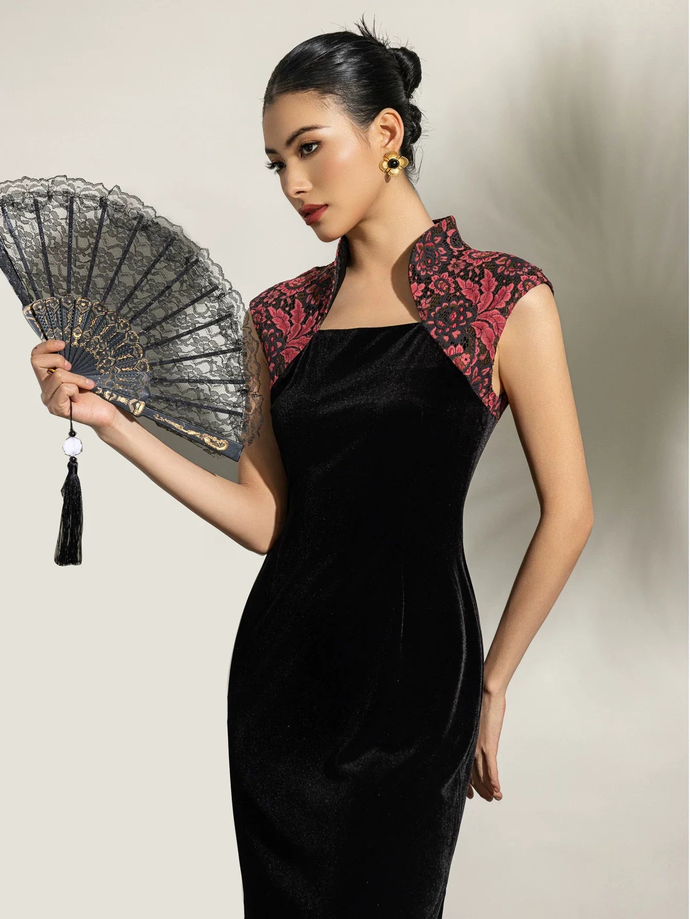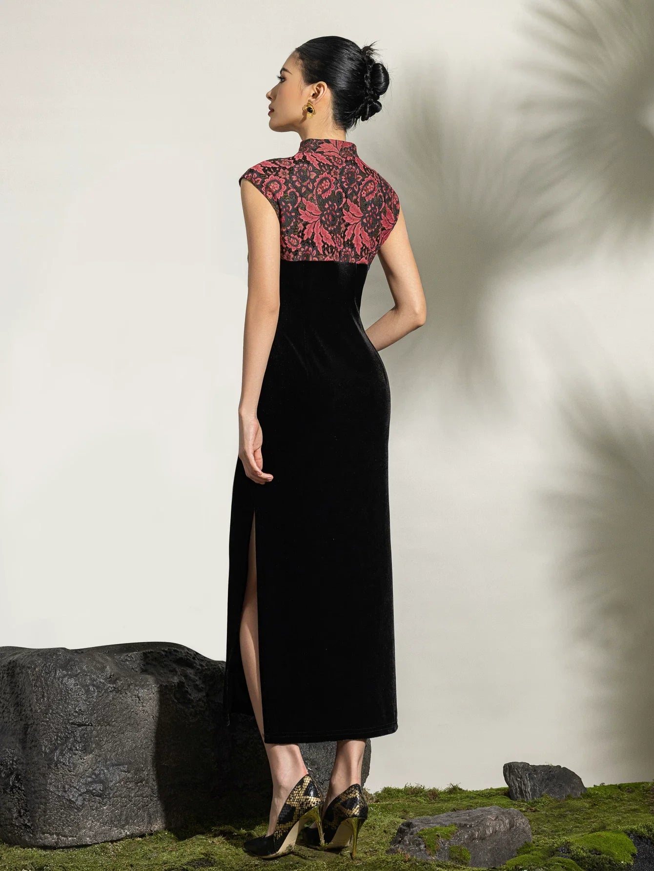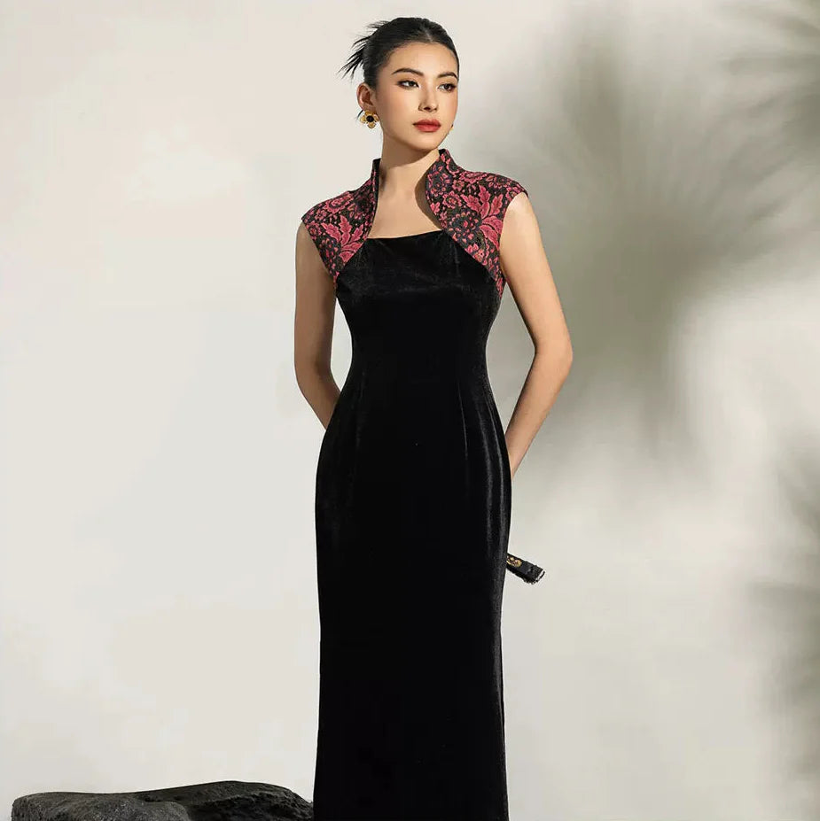 Magdalena Velvet Cheongsam Dress - Floral Embroidered Qipao with Mandarin Collar