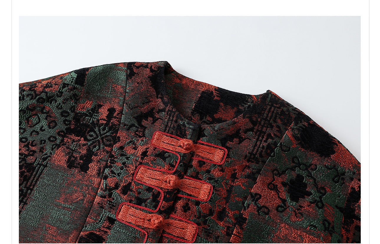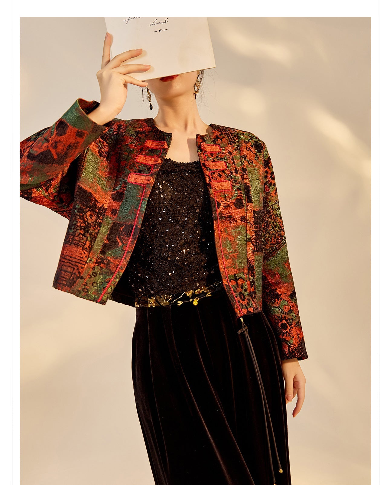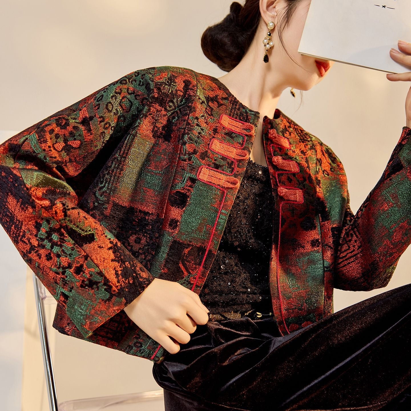 Embrace elegance with this unique jacquard jacket featuring stylish frog buttons. This modern Cheongsam-inspired Qipao jacket is perfect for early autumn, offering a sophisticated silhouette that complements various occasions. The slim-fit design enhances your figure while providing comfort, making it ideal for casual outings or festive celebrations.