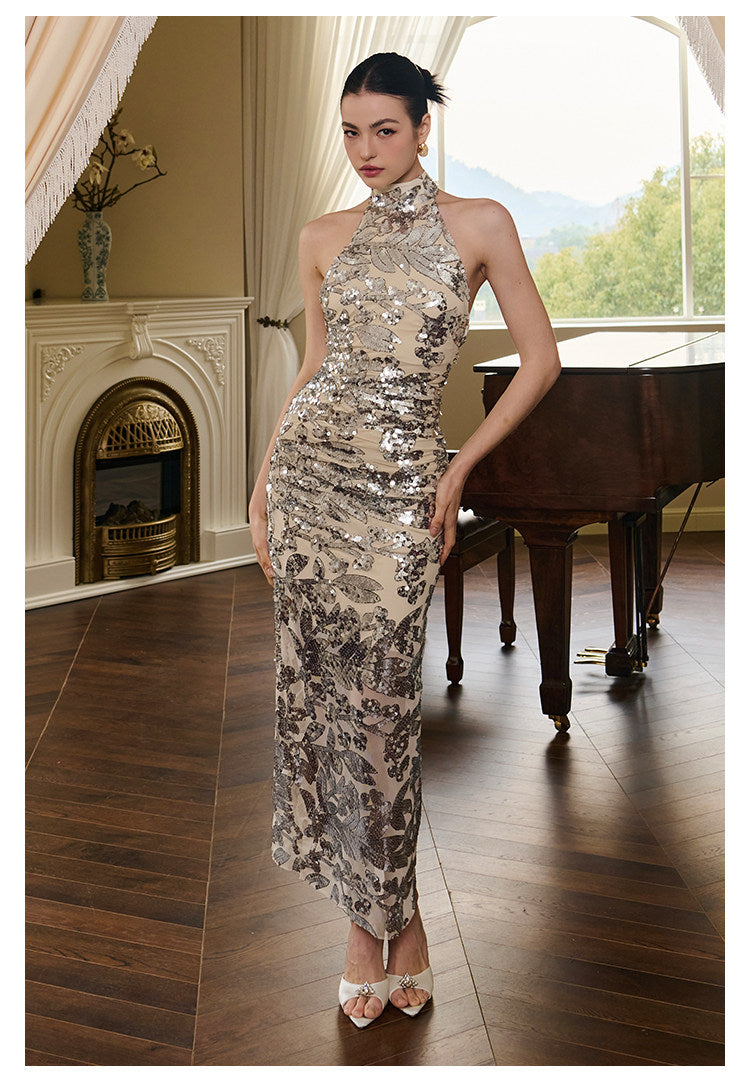 Step into elegance with this stunning Cheongsam Qipao dress featuring dazzling sequins and a chic halter neck design. Perfect for special occasions such as weddings or evening parties, this dress combines traditional elements with modern flair, showcasing your unique style and cultural heritage.