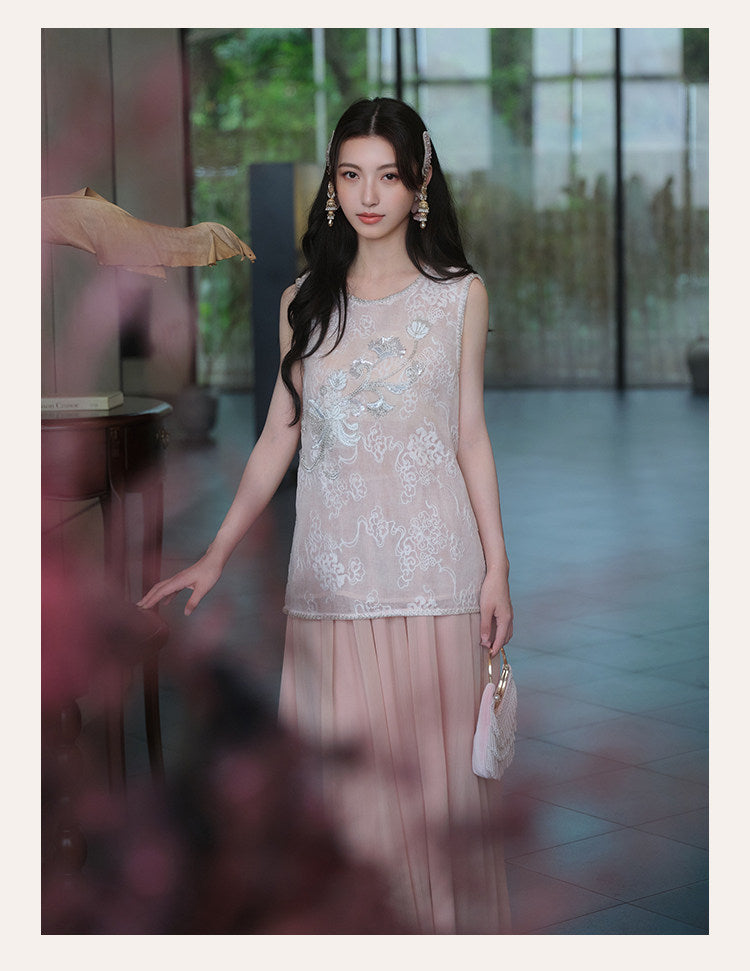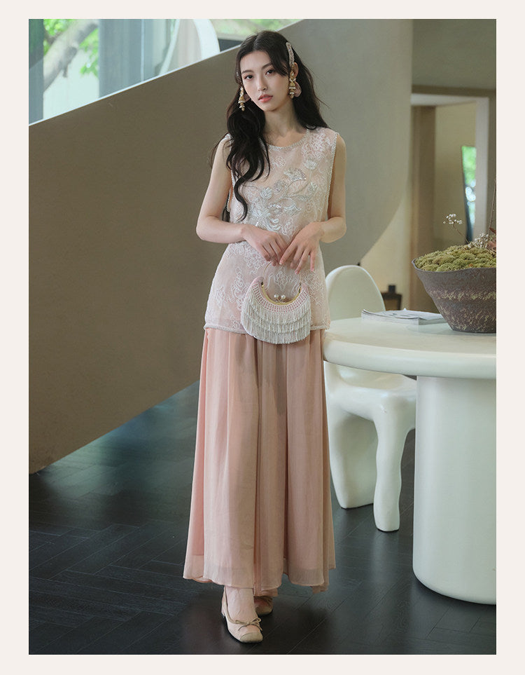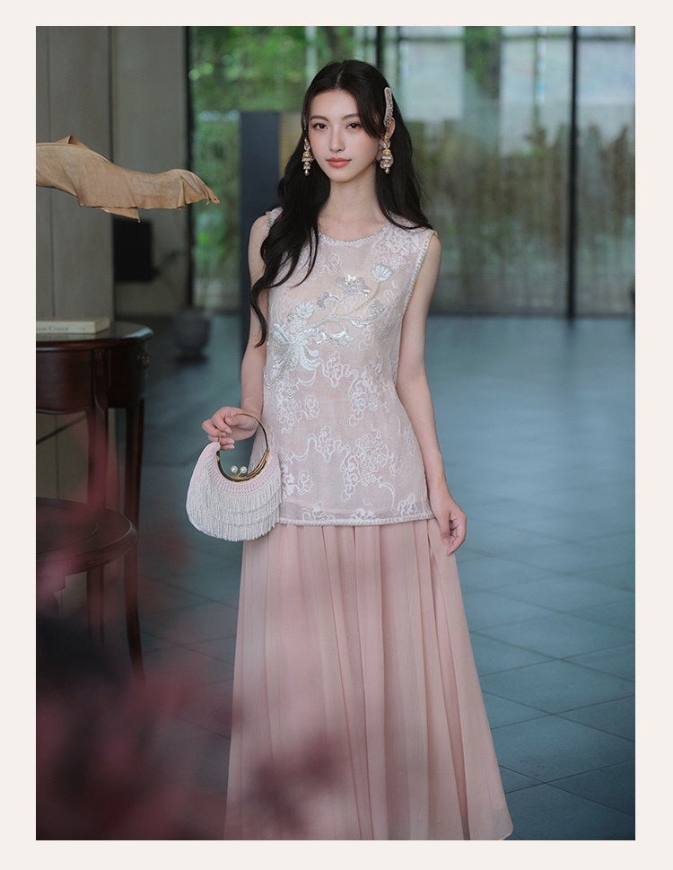 Rose Satin Glow Embroidery Qipao Cheongsam Two Piece